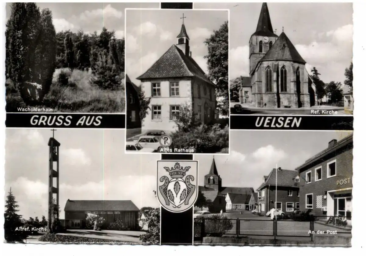 [Ansichtskarte] 4459 UELSEN, An der Post, Altref. Kirche, Reff. Kirche, Rathaus...