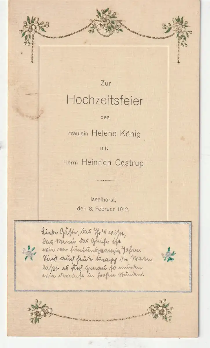 [Ansichtskarte] 4830 GÜTERSLOH - ISSELHORST, 3 prächtige Hochzeits-Menu-Karten, 1912, Helene König - Heinrich Cstrup.
