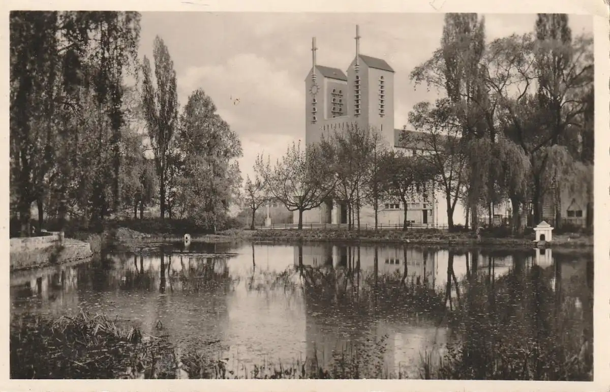 [Ansichtskarte] 6050 OFFENBACH, Weiher, Friedrichring, St. Josefskirche, 1951.