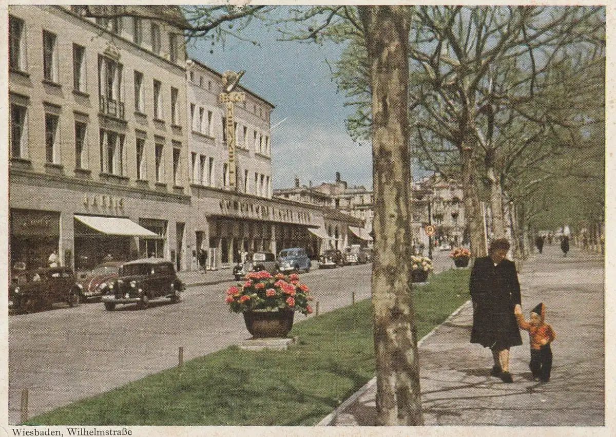 [Ansichtskarte] 6200 WIESBADEN, Wilhelmstrasse frühe 50er Jahre, Oldtimer OPEL, MERCEDES - BENZ , VW - Käfer.