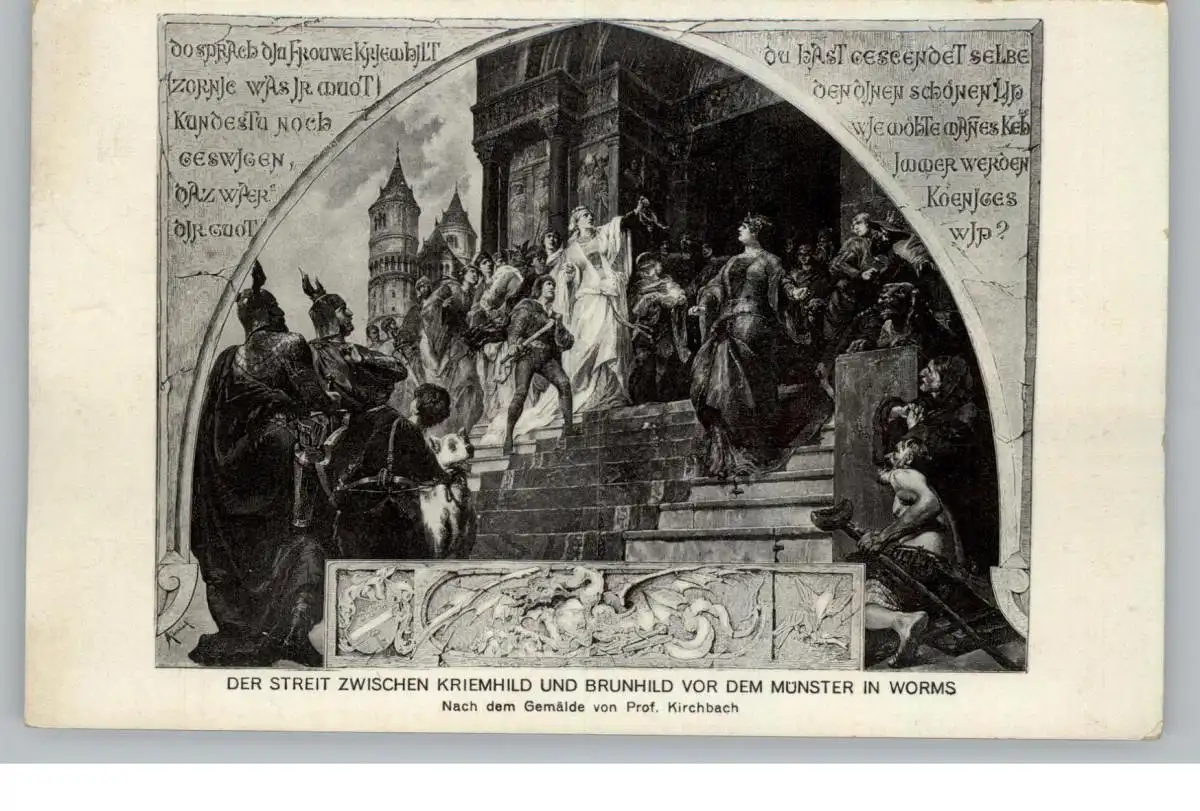 [Ansichtskarte] 6520 WORMS, Der Streit zwischen Krimhild und Brunhild vor dem Münster in Worms, nach Gemälde v. Prof. Kirchbach, Verlag Herbst 1937.