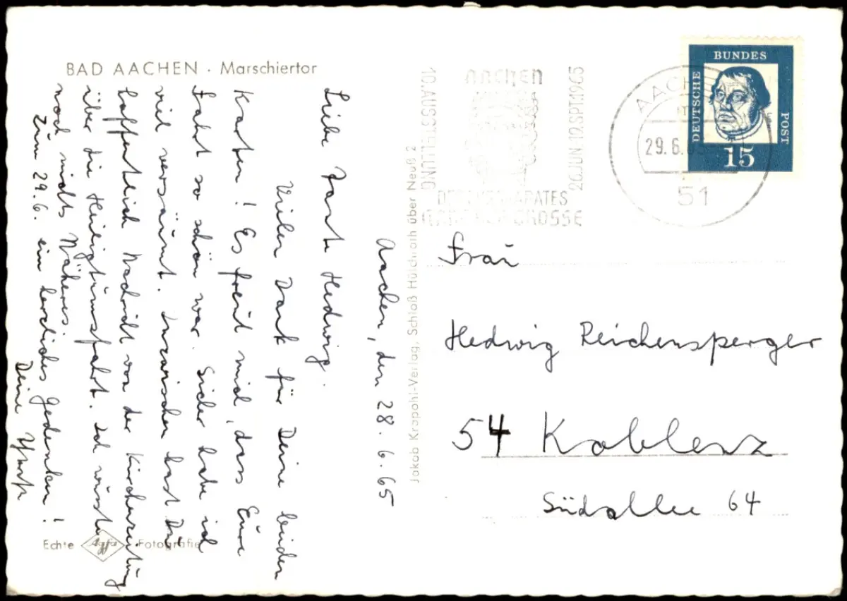 Infos: Echte Fotografie des Marschiertors in Aachen, eines der Haupttore der ehemaligen Aachener Stadtmauer. Die Ansicht zeigt das massive mittelalterliche Bauwerk mit seinem hohen Walmdach und den kleinen Ecktürmchen. Im Vordergrund und am Straßenrand sind PKW aus den 1960er Jahren sowie Grünanlagen zu sehen. Rückseitiger Aufdruck: 'BAD AACHEN Marschiertor' und 'Echte Agfa Fotografie'.