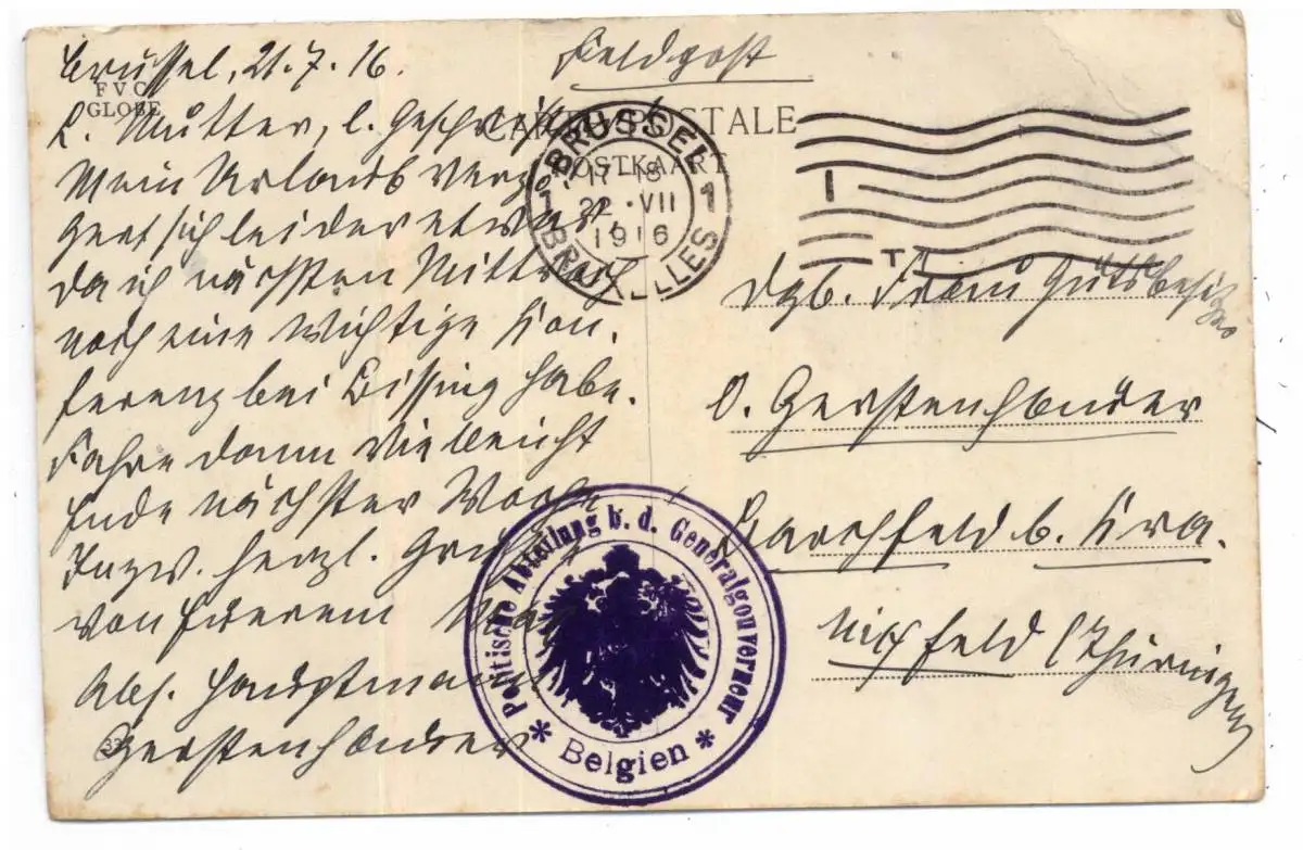 Titel: B 8000 BRUGGE, Gent poort, Deutsche Feldpost 1916 "Politische Abteilung beim deutschen Generalgouverneur Belgien", kleine Abteilung mit max. 100 Mitarbeitern