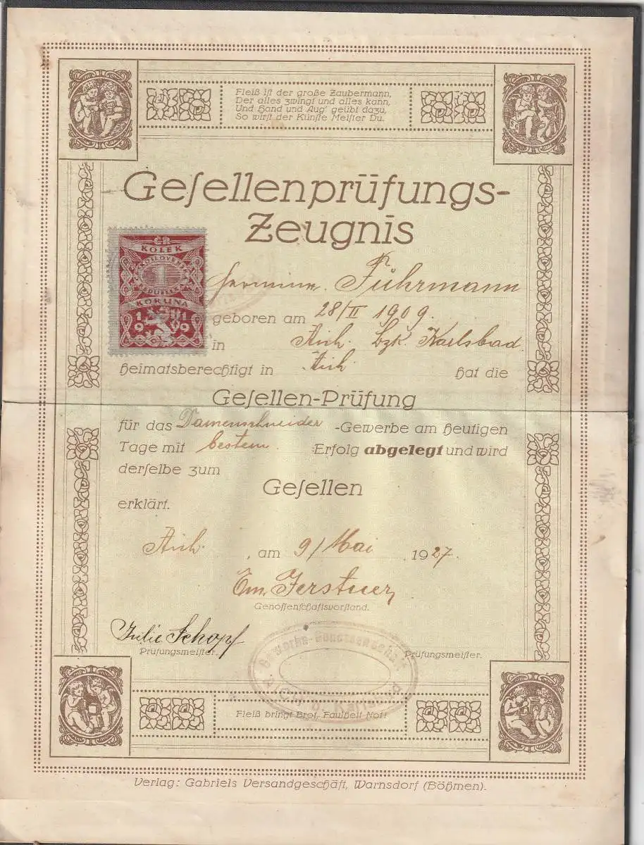 Titel: BÖHMEN & MÄHREN - KARLSBAD - AICH / KARLOVA VARY - DOUBI, Lehr- und Gesellenzeugnis für Damenschneider 1927