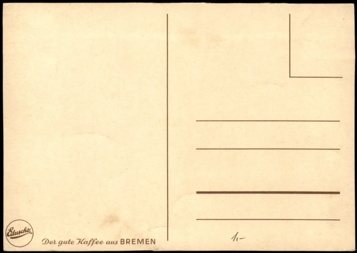 Infos: Künstlerische Ansicht des Bremer Marktplatzes nach einem Gemälde von G. Krüger. Im Vordergrund ist das historische Rathaus und die Roland-Statue zu sehen. Die Karte dient als Werbemittel für 'Eduscho Kaffee'.