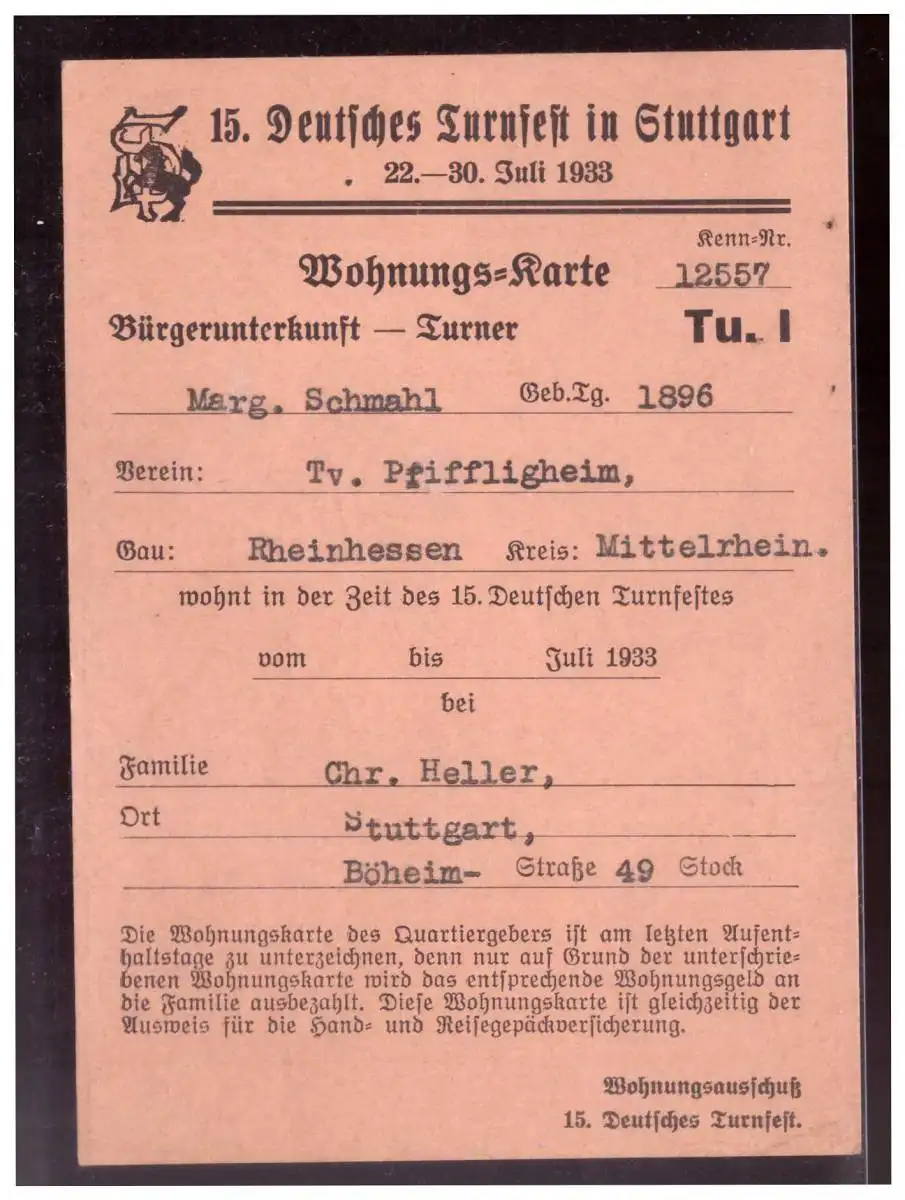 Titel: Dt- Reich (021118) Propaganda Wohnungskarte Deutsches Turnfest 1933 in Stuttgart