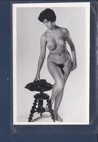 [Ansichtskarte] Foto Nackte Frau stehend mit Hocker.