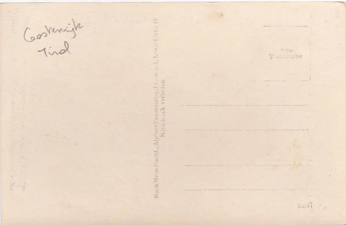 Verlagsangaben: Innsbruck, Leopoldstrasse 12, Much Heiss Nachf., Alpiner Kunstverlag, 1097.