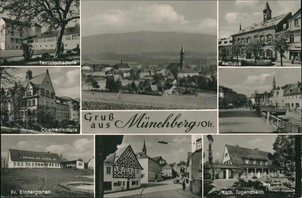 Ansichtskarte Münchberg Textilfachschule, Rathaus, Stadt 1961