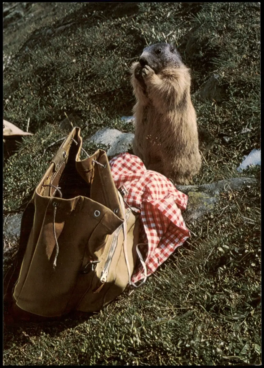 Ansichtskarte Murmeltier mit Rucksack 1970 Stempel Julierpass