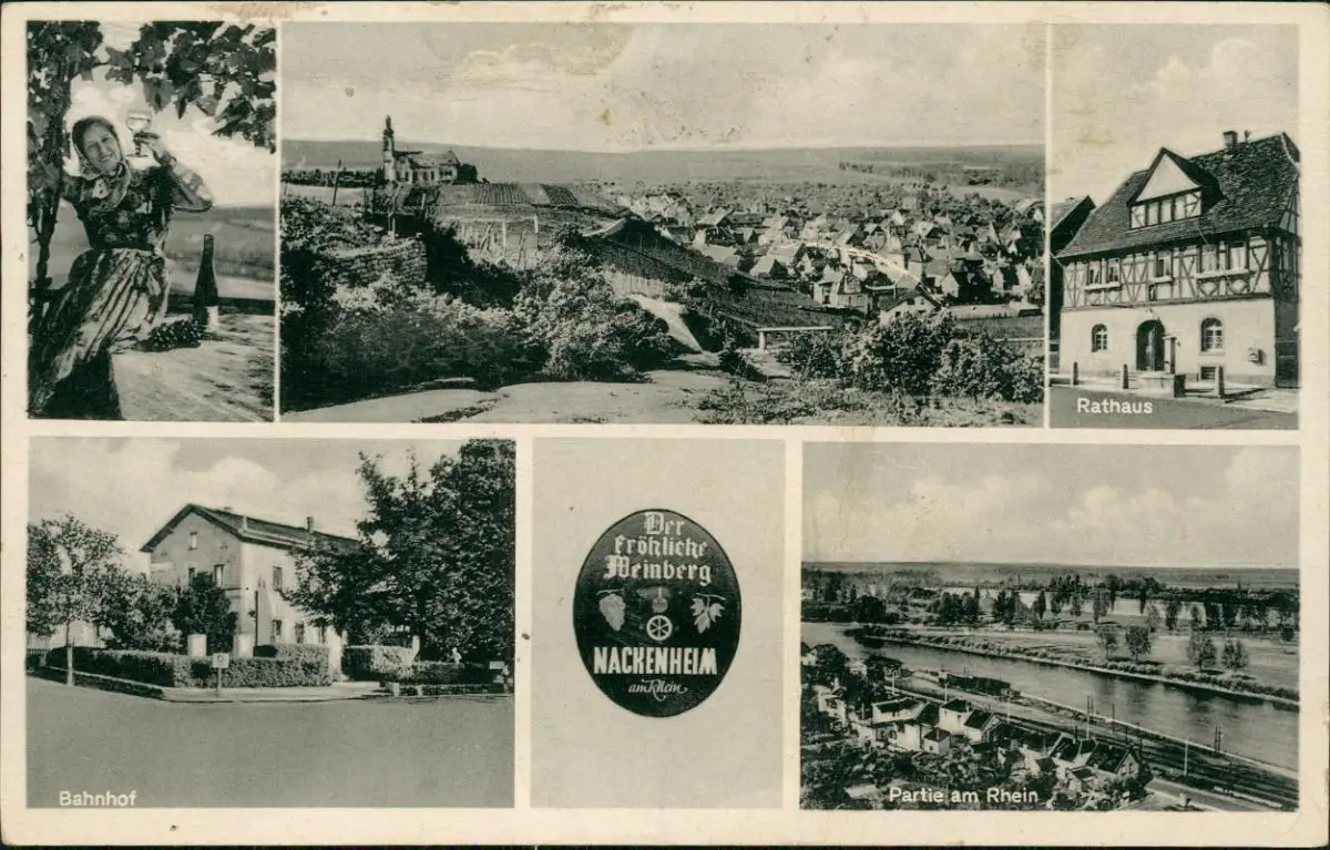 Ansichtskarte Nackenheim MB: Bahnhof, Stadt, Rathaus 1934