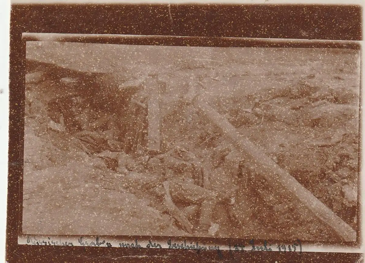 Titel: PL 06-300 PRZASNYSZ / PEZASSNITZ, 1. Weltkrieg, 2. Schlacht Juli 1915, eroberter russischer Schützengraben, tote Soldaten, Photo 11,7 x 8,2 cm