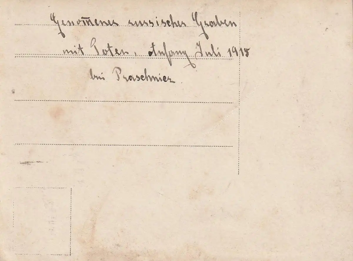 [Ansichtskarte] PL 06-300 PRZASNYSZ / PEZASSNITZ, 1. Weltkrieg, 2. Schlacht Juli 1915, eroberter russischer Schützengraben, tote Soldaten, Photo 11,7 x 8,2 cm.