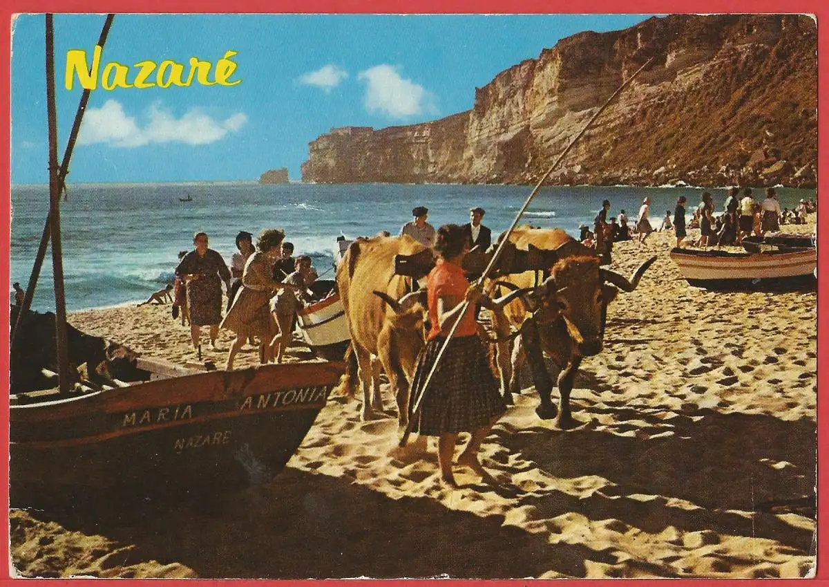 [Ansichtskarte] Portugal - Nazaré : Boote mit Ochsen hochziehen.