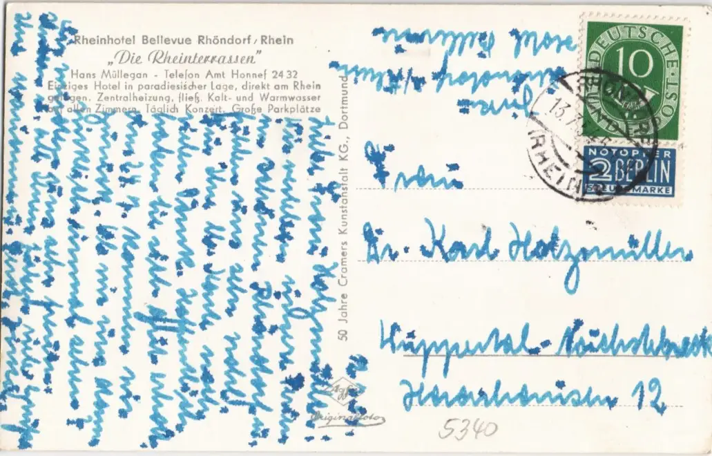 Ansichtskarte Rhöndorf-Bad Honnef Rheinhotel Bellevue 1954