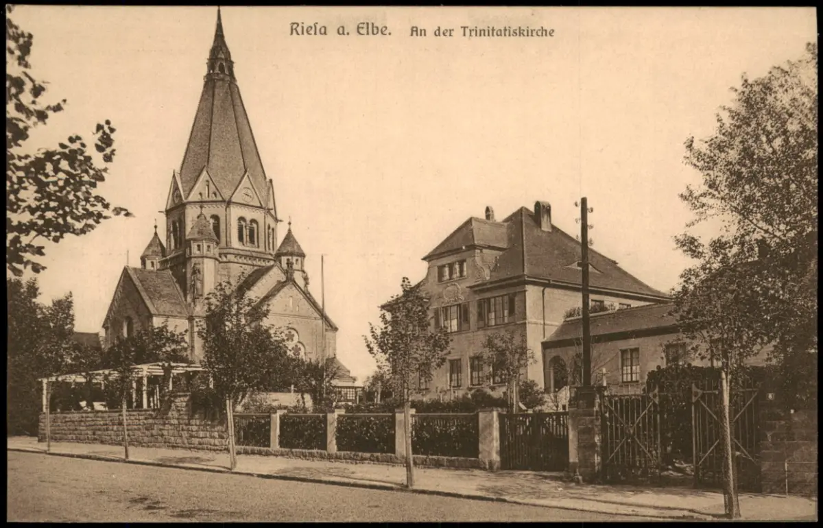 Ansichtskarte Riesa Straßenpartie Haus Trinitatiskirche 1913