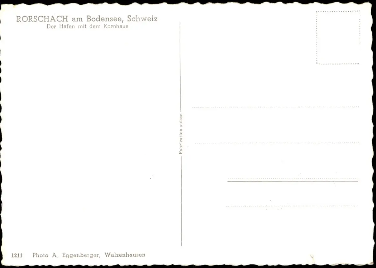 Infos: Schwarz-Weiß-Fotografie des Hafens von Rorschach am Bodensee in der Schweiz. Die Ansicht zeigt im Vordergrund Schwäne auf dem Wasser und einen geschwungenen Steg mit Spaziergängern. Auf der rechten Seite ist das historische Kornhaus prominent abgebildet. Im Hintergrund sind ein Schiff am Kai sowie Teile der Stadt Rorschach zu sehen. Die Karte wurde in der Schweiz hergestellt (Fabrication suisse) und stammt vom Fotografen A. Eggenberger aus Walzenhausen.