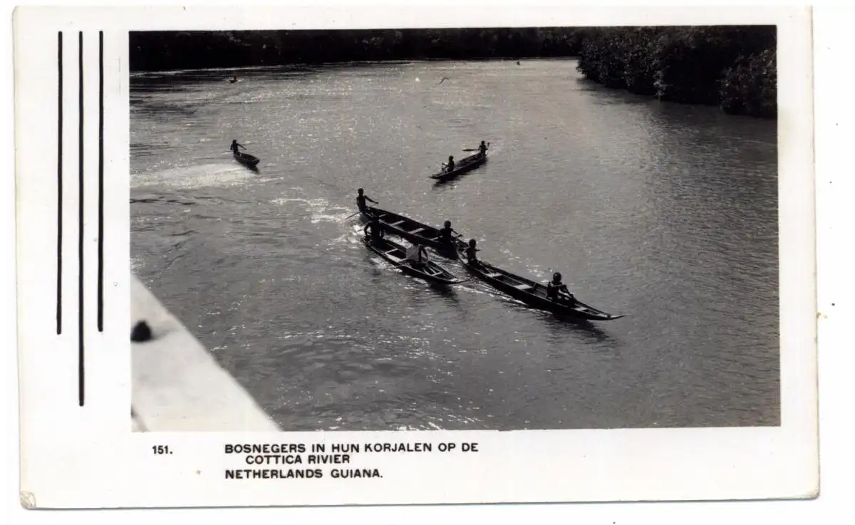 Titel: SURINAME / SURINAM / NIEDERLÄNDISCH GUYANA - Bosnegers in hun korjalen op de Cottica River.