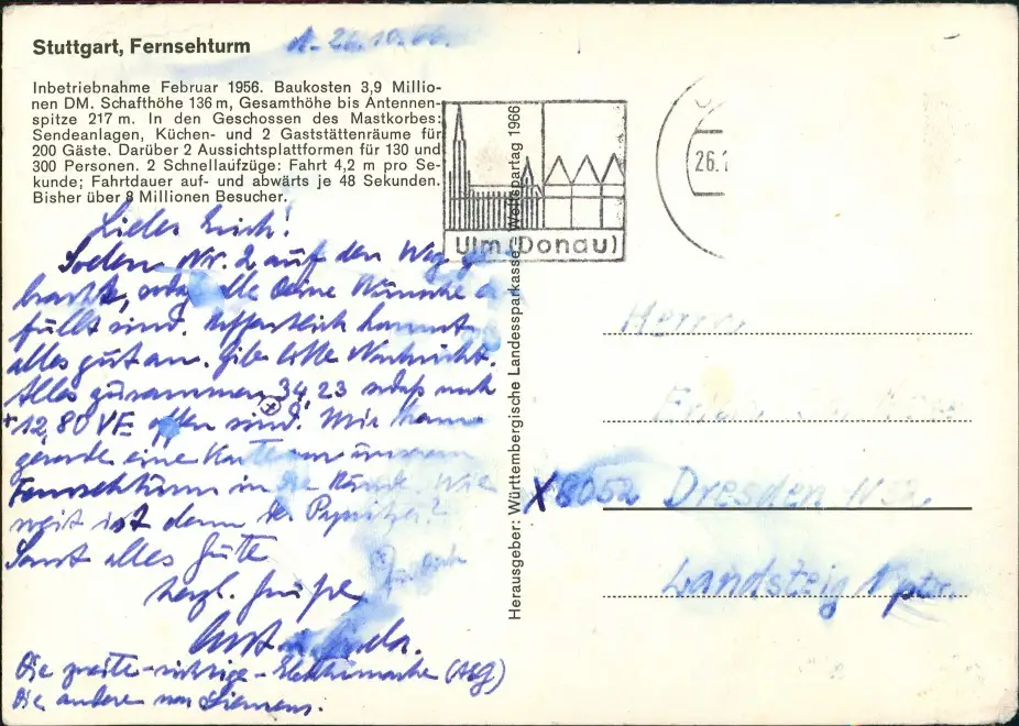 Ansichtskarte Stuttgart Fernsehturm, Stadt 1966