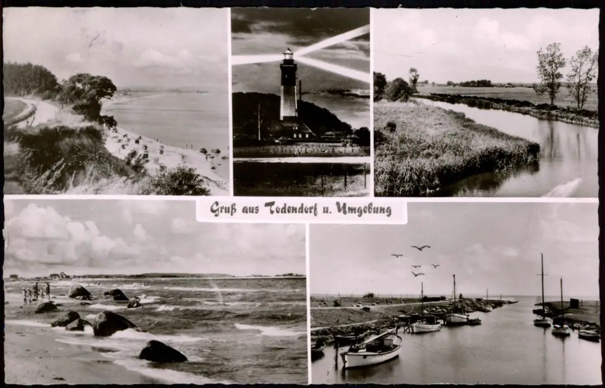 Ansichtskarte Todendorf MB: Strand, Leuchtturm, Boote 1954