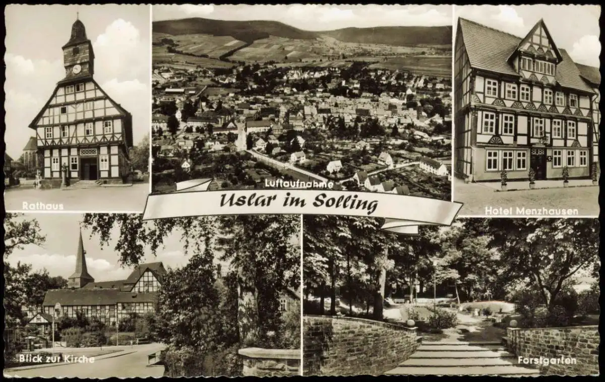 Ansichtskarte Uslar Rathaus, Panorama, Hotel, Kirche, Forstgarten 1965