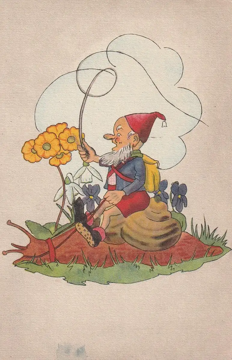 [Ansichtskarte] ZWERGE / GNOME / DWARFS / NANI, Zwerg reitet auf Schnecke / Snail / Escargot / Lumaca / Slak, kleiner Tintenfleck.