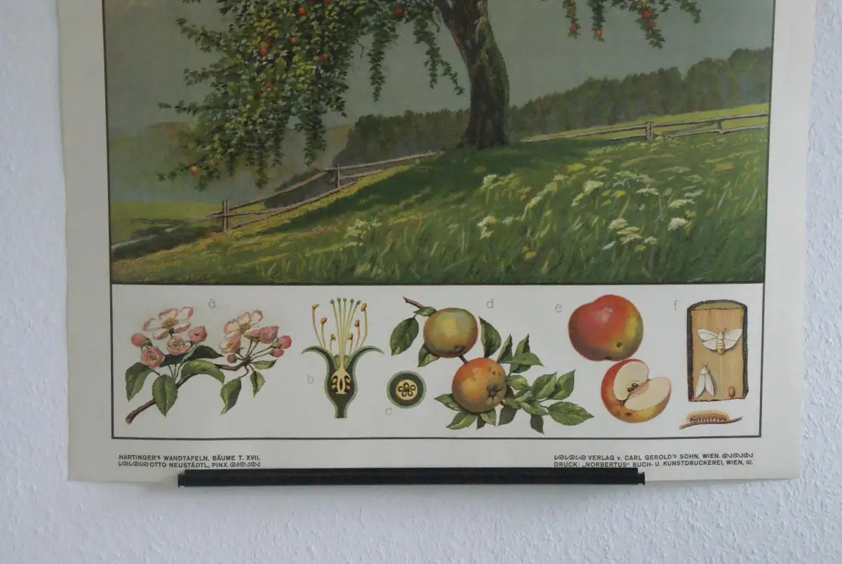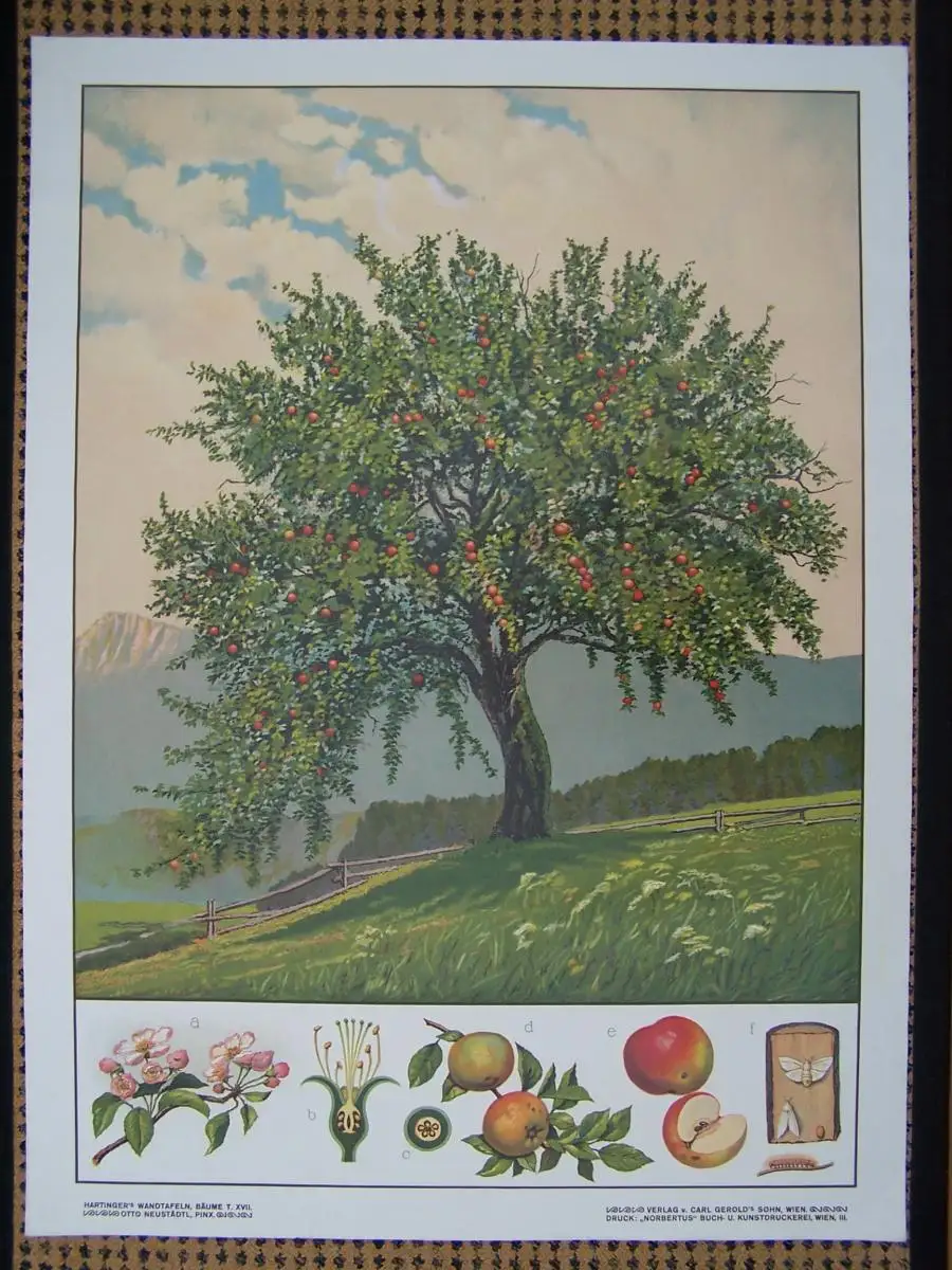 Kontraststarke und farblich prächtige Apfelbaum in Hügellandschaft mit Gebirgspanorama und Detaildarstellungen der Blüten, der Frucht und des Holzes gezeichnet für den Naturgeschichtlichten Anschauungsunterricht (Format: 72 x 98cm). Die Tafel bildet die 6te Schulwandtafel der Bäume von "Hartinger's Wandtafeln", in der eine Reihe von botanischen und zoologischen Objekten zumeist aus 8 oder 10 farbigen Chromolithographien gefertigt wurden. Während bei den älteren Tafeln die Farben rein deckend oder mit Spritzmanier in Farbmischung erschienen, sind bei den unter dem Einfluss des Jugendstils entstandenen Tafeln verschiedene Tangiermanieren angewendet worden, die den Farbflächen unterschiedliche Punkt- oder Strichraster verleihen. Nur wenige Tafeln wurden in farbiger Autotypie gedruckt.