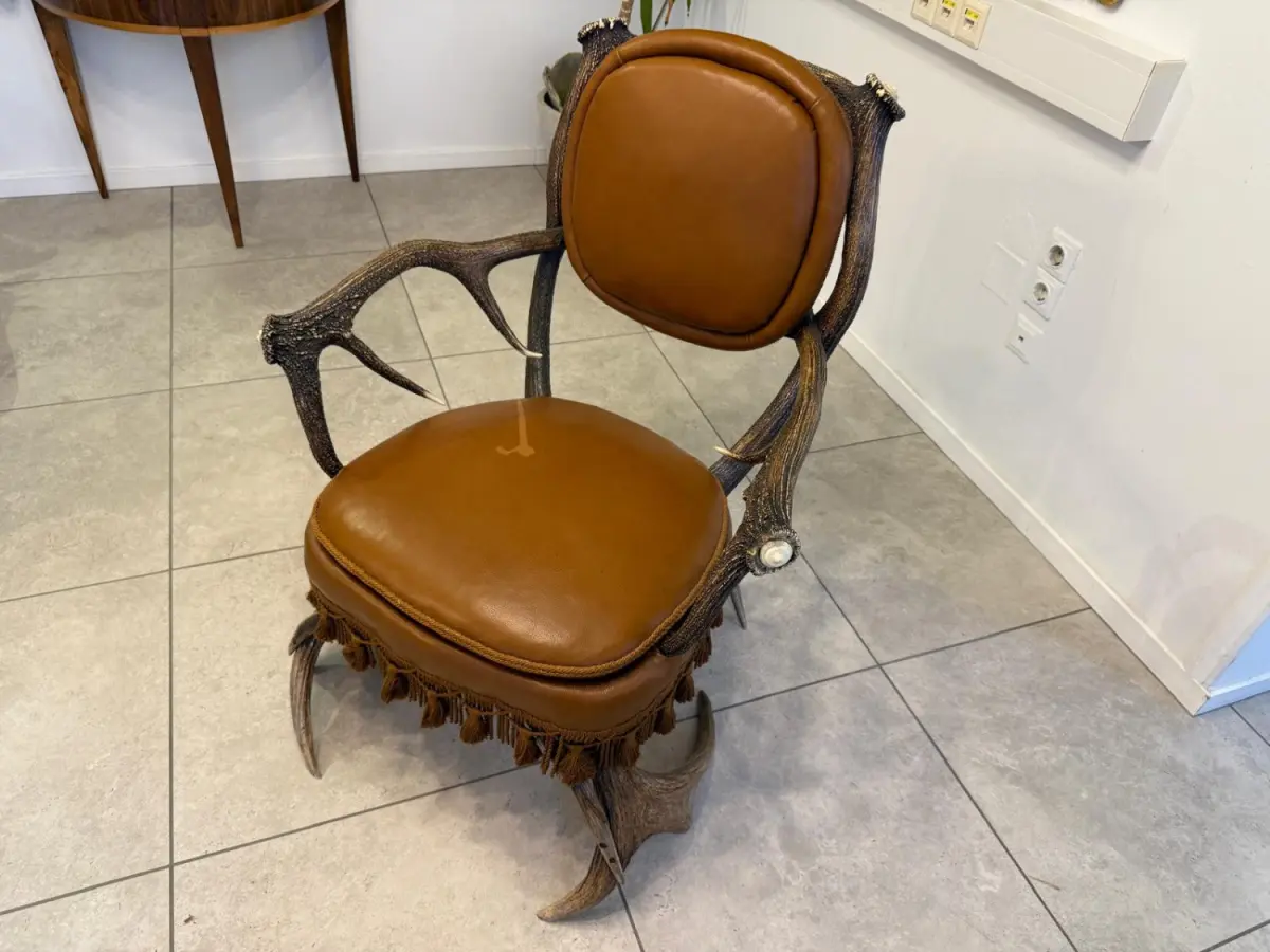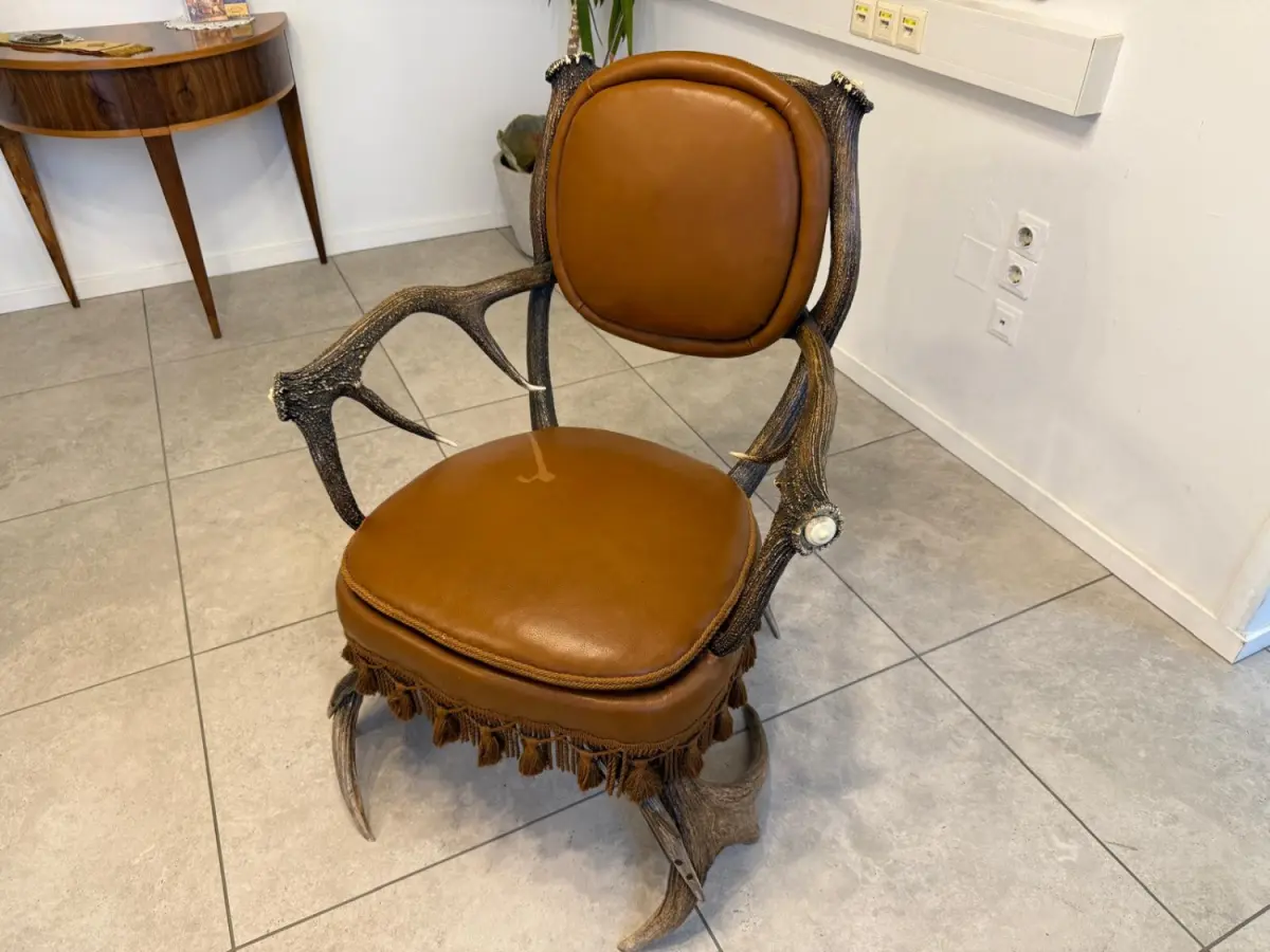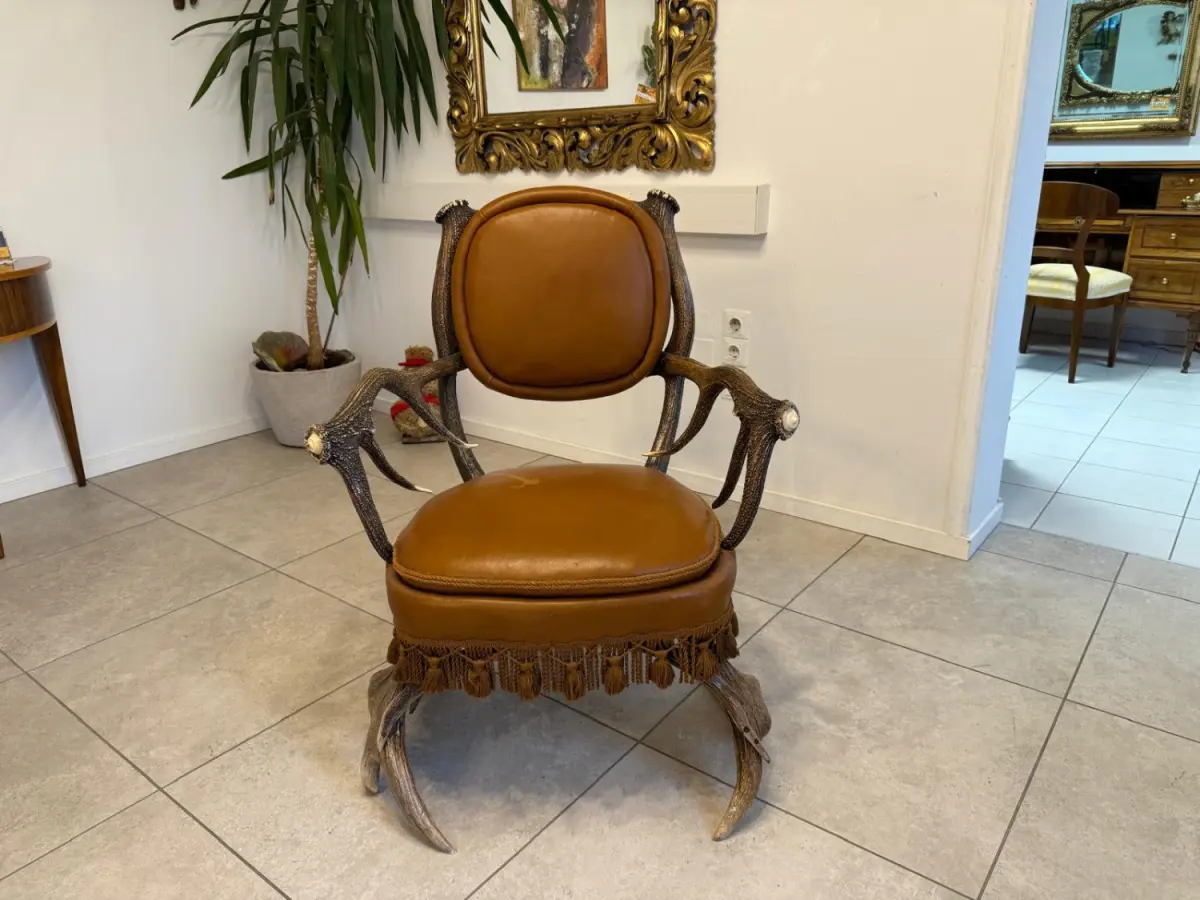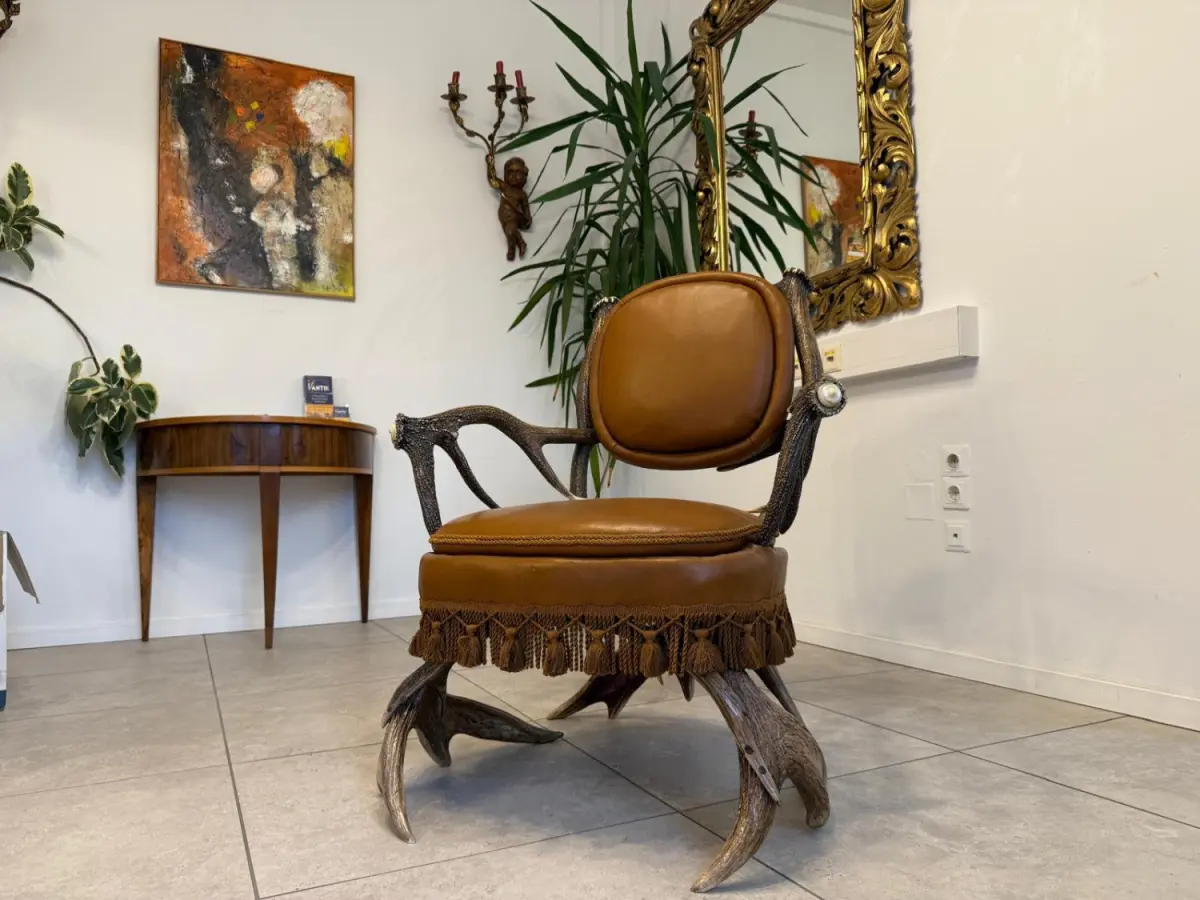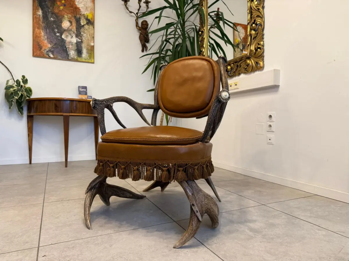 Durch die Verwendung natürlicher Materialien steht dieses Stück für gelebte Nachhaltigkeit, und hochwertige Geweihmöbel aus dieser Epoche gelten zudem als wertstabil mit langfristigem Sammlerpotenzial.