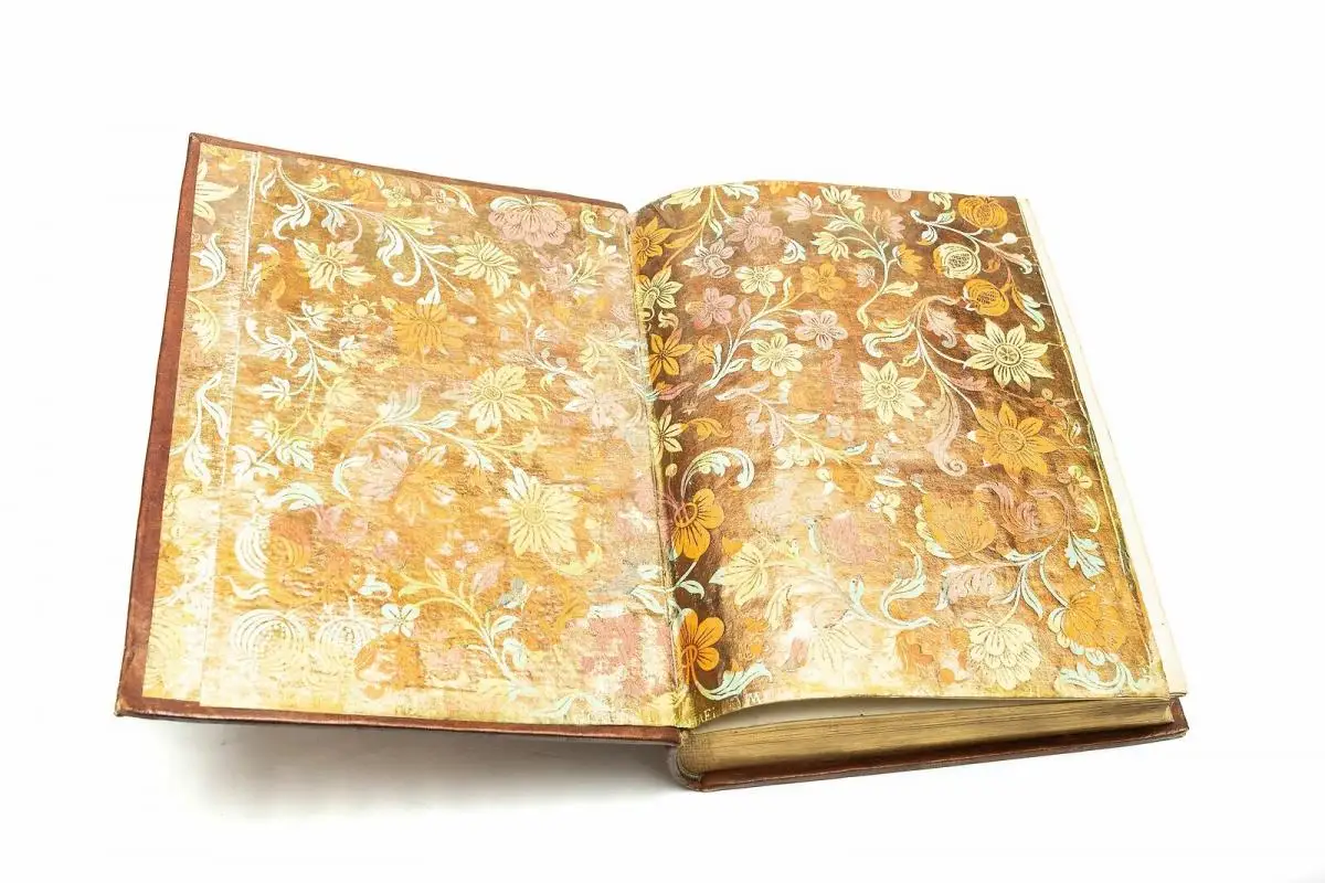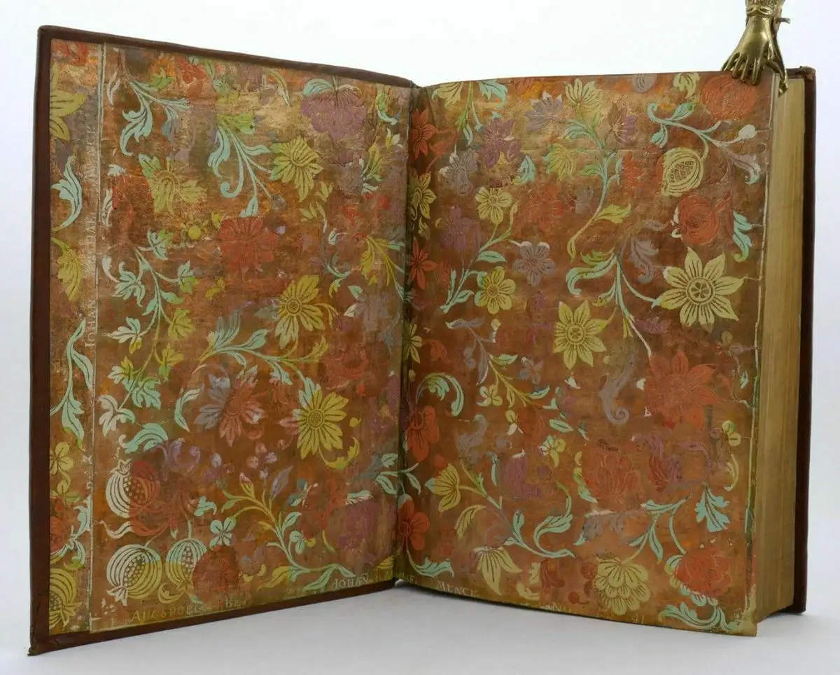 Bemerkungen: Prachtvoller venezian. Lederband mit reicher Rankengoldprägung. Farb. floraler Brokatvorsatz (No. 41) von Johann Michael Munck, dessen Werkstatt zu den bedeutendsten Werkstätten für Brokat- u. Buntpapier in Augsburg zählte. 4°. 766 pp. (title in red and black) with engraved title-vign. Contemp. leather-binding richly floral gilt stmaped. Gilt edges. Small stamp on front endpaper and title. - Beautiful Venetian leather binding with rich floral gold embossing. Colored. floral brocade endpapers (No. 41) by Johann Michael Munck, whose workshop was one of the most important workshops for brocade- and coloured paper in Augsburg counted.
