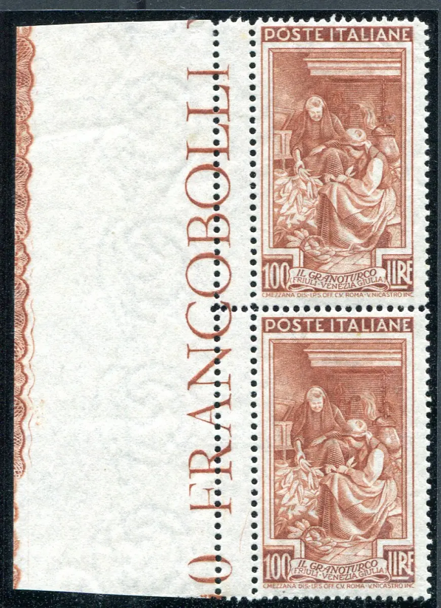 Arbeit Lire 100 Doppelverzahnung 14,1/4 x 13,1/4 Sorten Vollgummi - Arbeit Lire 100 Nr. 651 Verzahnung 14,1/4 x 13,1/4 vertikales Paar b. von f. mit doppelter vertikaler Verzahnung links am Blattrand - Ausgezeichnete Zentrierung, ungewöhnlich Cod. 524/13