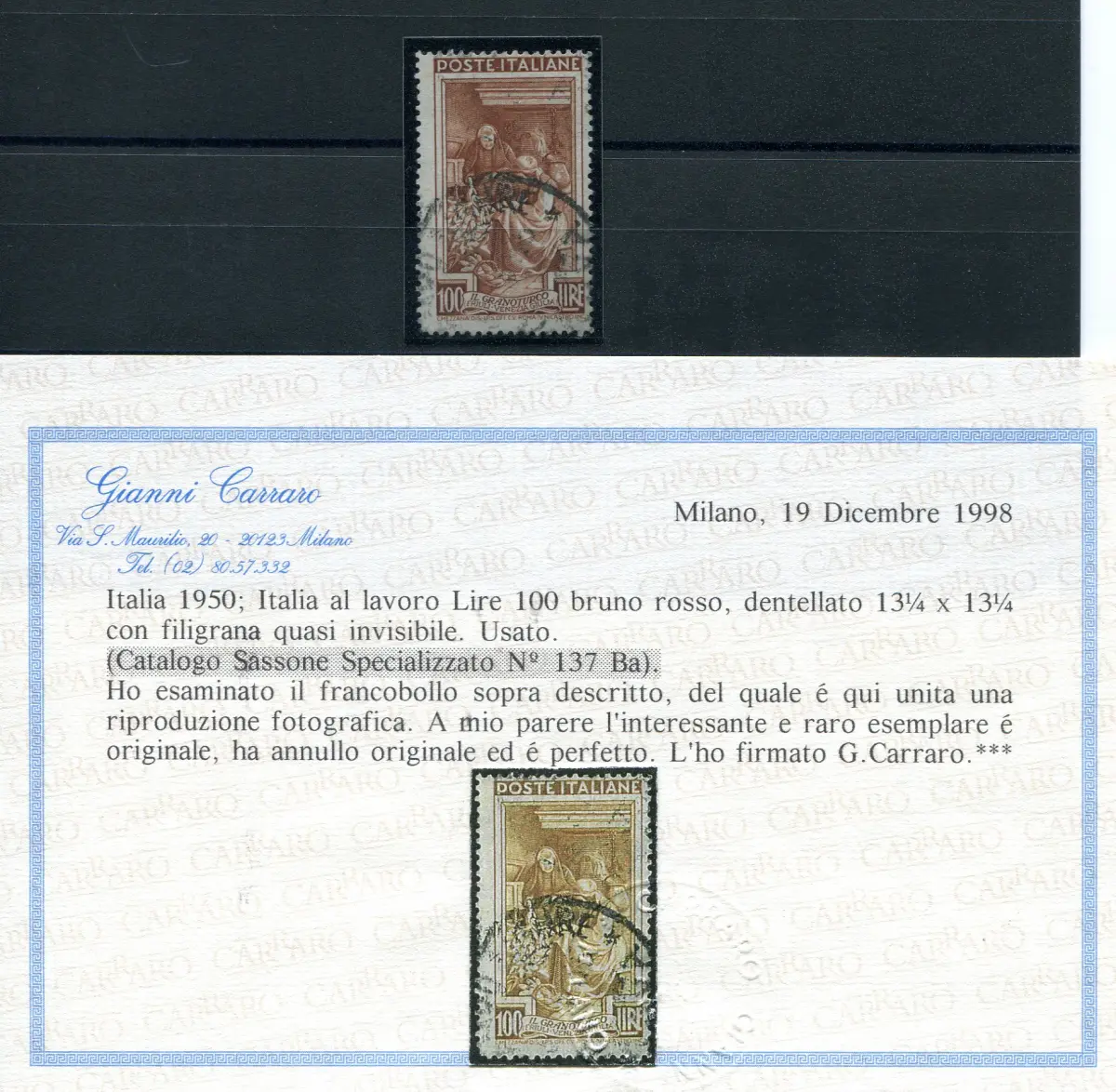 Arbeit Lire 100 Verzahnung 13,1/4 x 13,1/4 mit unsichtbarem Wasserzeichen gebraucht - Arbeit Lire 100 Nr. 651 Verzahnung 13,1/4 x 13,1/4 mit fast unsichtbarem Wasserzeichen (Sass. spec. Nr. 137 Ba) - Dal Cert. Carraro ..Meiner Meinung nach ist das interessante und seltene Exemplar original .. Cod. 530/13