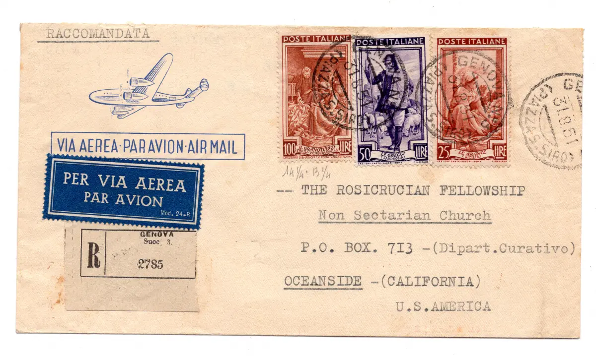 - Arbeit Lire 100 Nr. 651 + Ergänzungen Nr. 643 + 647 auf Umschlag Racc. per Luftweg von Genua in die USA (Kalifornien) am 31.8.51 - letzter Tariftag - Uncommon Nr. 668/19