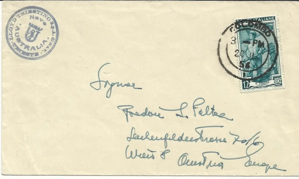 Arbeit Lire 12 Nr. 640 isoliert auf Direktumschlag in Österreich - Arbeit Lire 12 Nr. 640 isoliert auf Direktumschlag in Österreich wohl an Bord des Schiffes Australien eingepackt (wie aus Ann. gestempelt) die Briefmarke wurde mit vermutlich bei der Landung angebrachter US-Stempel Kolumbus gestempelt - Kuriosität Nr. 515/5
