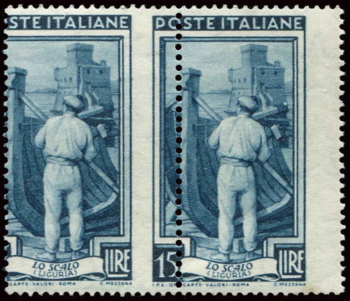 Arbeit Lire 15 Paar Sorte verschobene Verzahnung Vollgummi MNH - Arbeit Lire 15 Nr. 757 horizontales Paar mit stark verschobenen vertikalen Verzahnung - ein Exemplar ohne Ziffer 15 (Nr. 757b, 757c) - Selten - Kat. euro 200 Cod. 454/15