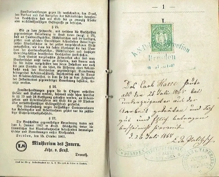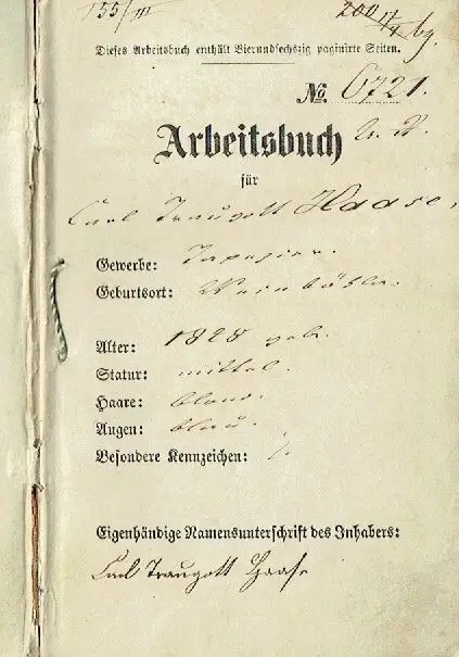 guter bis sehr guter Zustand, geringe Gebrauchs- und Alterungsspuren, In der Vergangenheit umfasste das erheblich umfangreichere Betätigungsfeld des Tapezierers neben der Anbringung von Wand- und Deckenverkleidungen nahezu alle Aufgaben der Drapierung, Ausstaffierung und Dekoration von Zimmern, Sälen und sonstigen Räumlichkeiten, einschließlich der Anfertigung von Fenster- und Bettvorhängen, Paravents, Kaminschirmen, Baldachinen, und Betthimmeln, Polstern, Matratzen und dergleichen mehr. Das Metier entsprach in etwa dem des heutigen Raumausstatters (siehe dort). Das Amt des Hoftapezierers war an Königs- und Fürstenhäusern eine käufliche charge. (Wikipedia) Arbeitsbuch eines Tapezierergehilfen aus Weinböhla, ausgestellt am 27. Mai 1867 in Dresden im Juli 1868 beginnt er seine Wanderschaft, die ihn zuerst zu 2 anderen Tapezierermeistern in Dresden führte und anschließend über das damals noch russische Warschau (1869) in die russische Ukraine (Kiev 1869) führt, 1871 ist der letzte Vermerk bei einem C. A. Palitzsch in Dresden (Seite 6) - danach kommen nur noch Einträge bei den Reisevisas (ab Seite 49), die Abmeldung in Dresden 1869 und anschließend 4 russische Einträge bis 1870 in Kiev alles mehr oder weniger leserlich gestempelt, Dresdner Magistratssiegel auf Seite 64 noch ungebrochen, Büchlein enthält auch 3 sogenannte Visirmarken der Dresdner Polizei-Direktion mit einer Gebühr von 2½ Ngr. (Neugroschen), Halbleinen, ca. 10 x 15,5, 64 Seiten