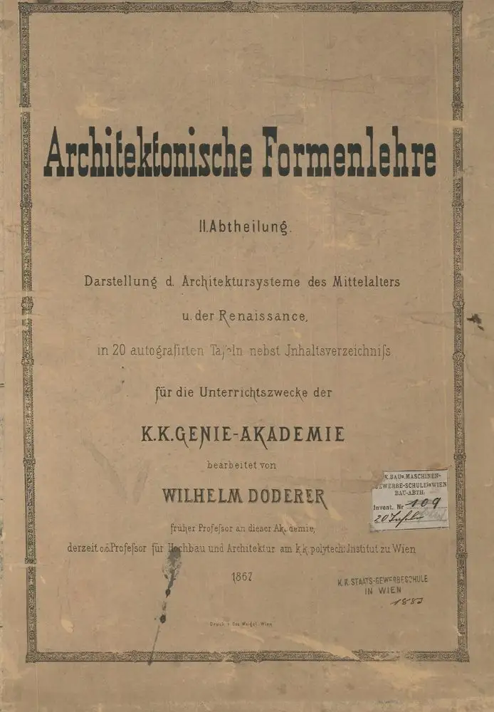 ArtikeldetailsArchitektonische Formenlehre. II. Abtheilung. Dartellung d. Architektursysteme des Mittelalters u. der Renaissance in 20 autografirten Tafeln [...] für die Unterrichtszwecke der k. k. Genie-Akademie. DODERER, Wilhelm.