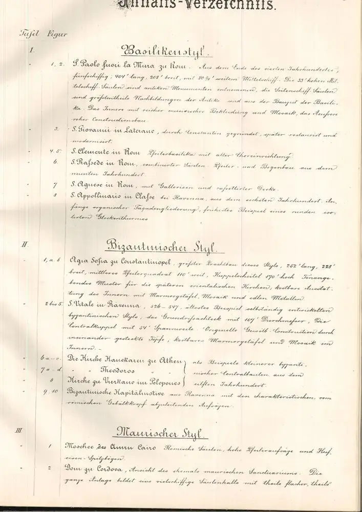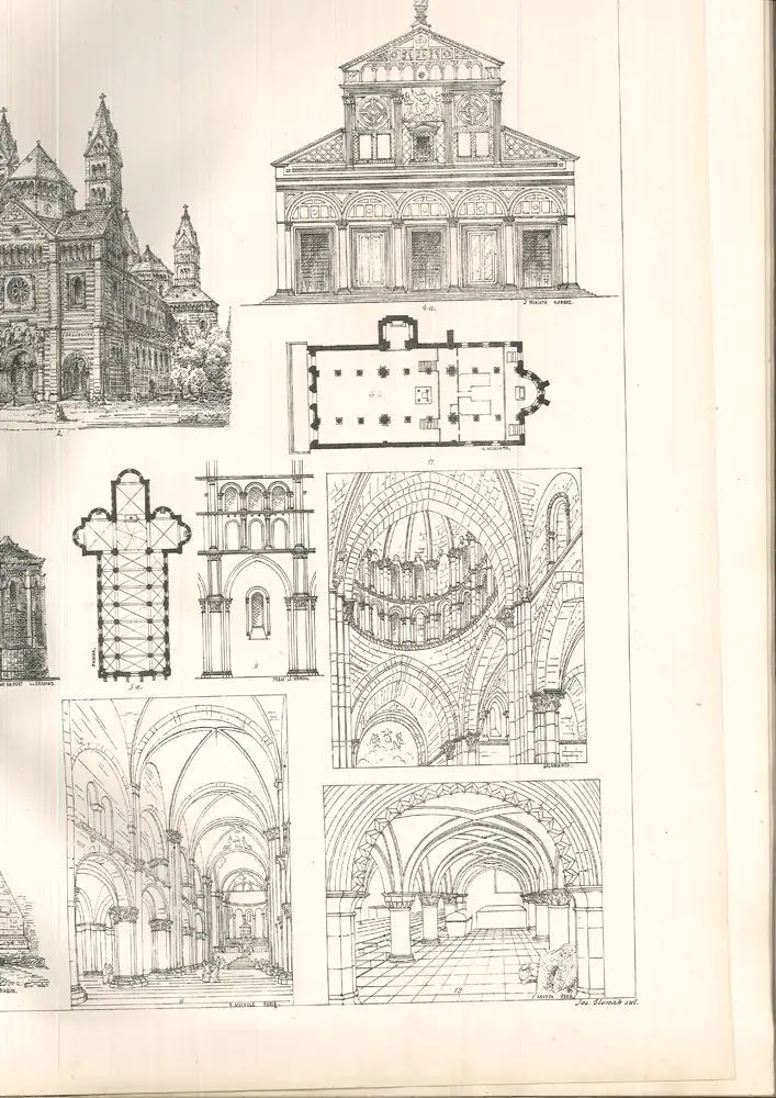 Bemerkungen: Seltenes architektonisches und zur Gänze im lithographischen Autographie-Verfahren gedrucktes Lehrwerk zur Geschichte der Architektursysteme des Mittelalters und der Renaissance. Wilhelm Doderer (1825-1900) war ein österreichischer Architek und ab 1852 als "Professor der schönen Architektur" an der Genie-Akademie tätig, der Schriststeller Heimito von Doderer war sein Enkel. Die Tafeln zeigen u. a. S. Paolo fuori le mura, die Hagia Sophia, die Dome zu Worms, Mainz, Bamberg und Köln, sowie die Kathedralen von Reims, Notre Dame von Paris und Clemont, außerdem Profanbauten wie den Palazzo Farnese, Pandolfini und das Heidelberger Schloss. Die Tafeln sind jew. im Stein signiert "J. Slowak autograf.".