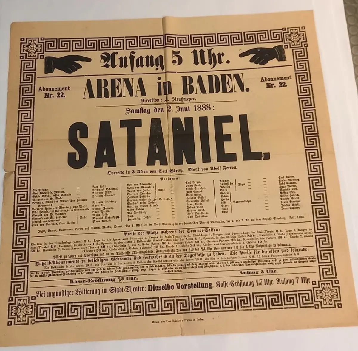 Bemerkungen: Theaterplakate der 1841 gegründeten (Sommer-)Arena in Baden, Sommersaison 1888. VORLIEGEND:I. 2. Juni 1888: Sataniel. Operette in 3 Akten von Carl Görlitz; II. 16. Juni 1888: Die Dreizehn. Komische Oper in 3 Akten. Von F. Zell. u. R. Genée: III. 23. Juni 1888: Benefice für Hern. Julius Riedt. Letzte Liebe. Schauspiel in 5 Akten aus dem Ungarischen des L. Doczi; IV. 25. Jnui 1888: Eine Nacht in Venedig. Komische Operette in 3 Akten mit freier Benützung einer französischen Grundidee von F. Zell u. Richard Genée; V. 6. Juli 1888: Fioretta. Operette in 3 Akten von Alexander Landesberg; VI. 11. Juli 1888: Die sieben Schwaben. Volksoper in 3 Akten von Hugo Wittmann u. J. Bauer;