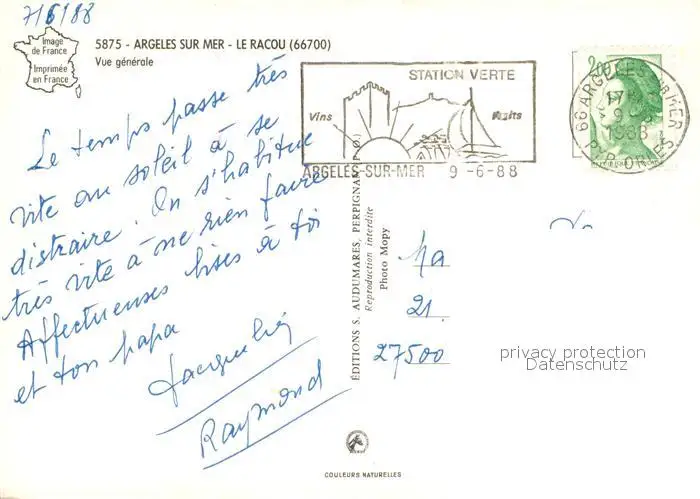 Argeles-sur-Mer Plage du Racou vue aérienne Argeles-sur-Mer postalisch gelaufen 1988 Erhaltung siehe scans [FriedD77] Frierer