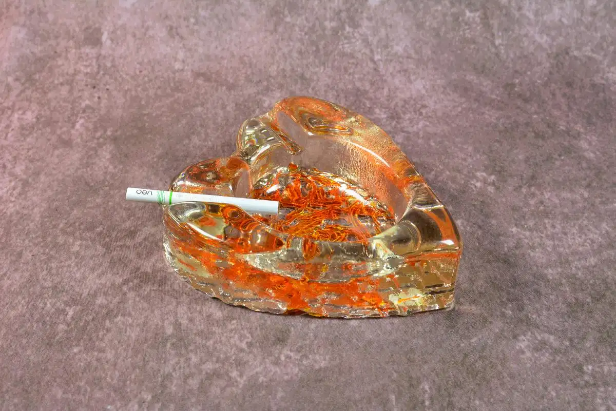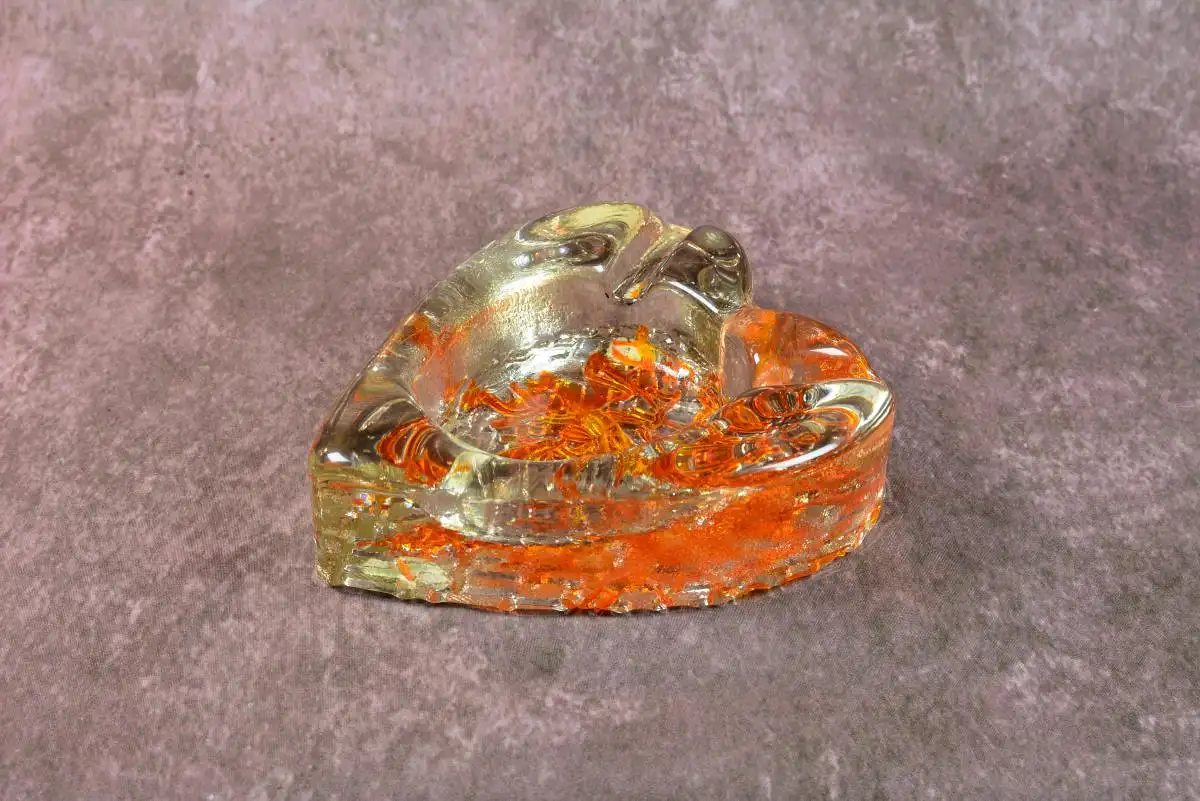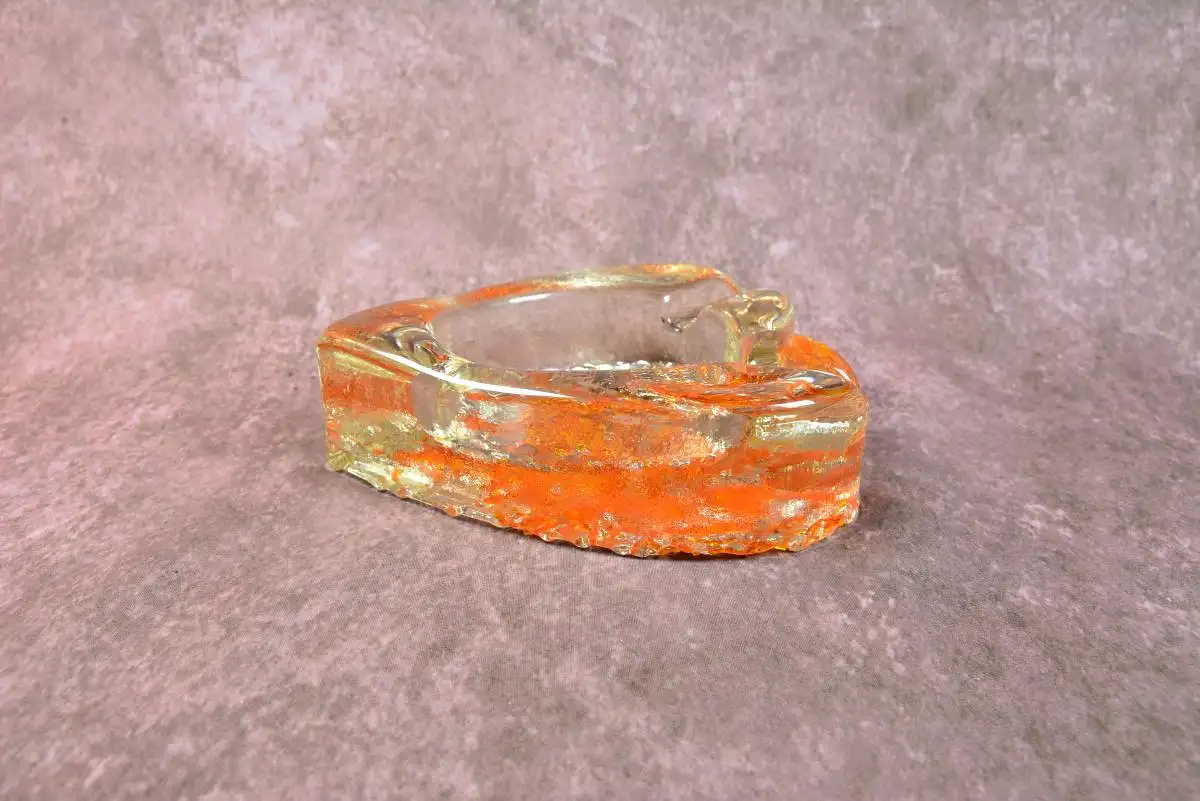 Aschenbecher,Herzform,Glas,Mosaikeffekt,Mitte, 20., Jahrhundert,orangefarbene, Einschlüsse,Sammlerstück,Vintage-Dekor