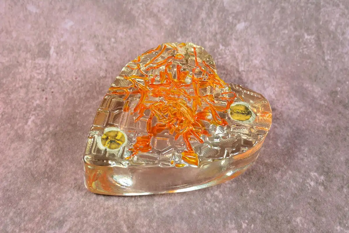 Glas-Aschenbecher in Herzform mit mattierten Wänden und orangefarbenen Einschlüssen, die einen Mosaikeffekt erzeugen, Mitte 20. Jahrhundert. Sehr guter Zustand, Gewicht 900 g. Ideal für Sammler von Vintage-Glaswaren oder als dekorativer Akzent.