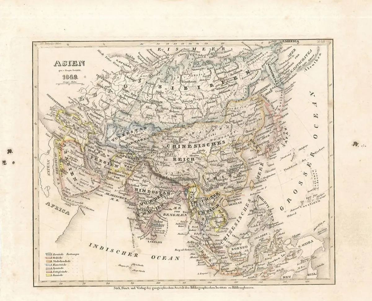 Hildburghausen, Bibliographisches Institut [um 1849]. Altkol. gest. Karte. 23 x 29 cm.(Blattgr.) 19 x 23,5 (Plattengr.). Etwas gebräunt, mit kl. Tintenflecken im w. Rand.