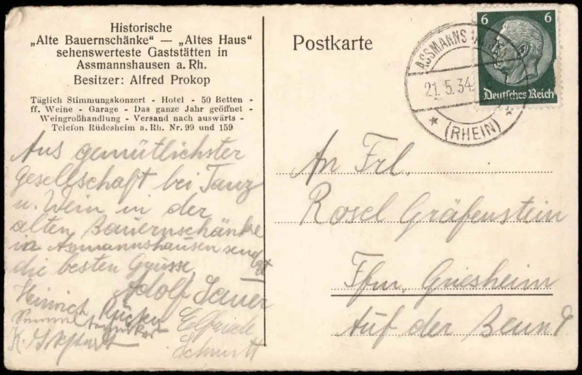 Assmannshausen Rüdesheim (Rhein) „Alte Bauernschänke“ – Gaststube 1934