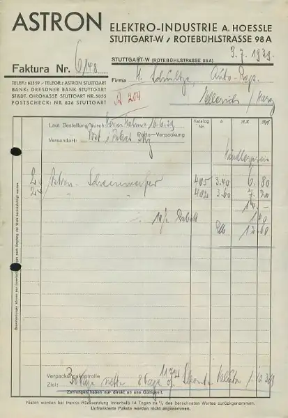 Astron Elektro Industrie, Stuttgart Schreiben 1939/41