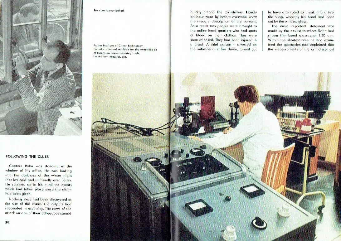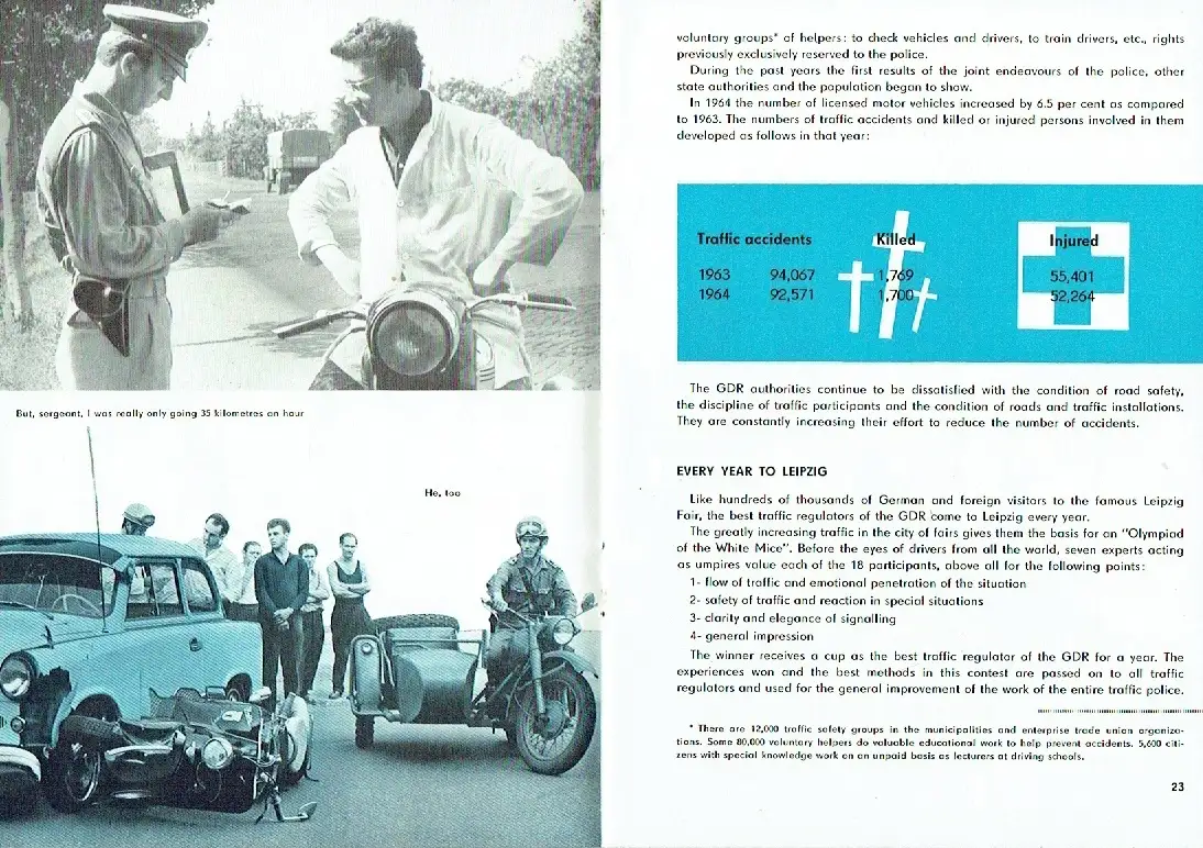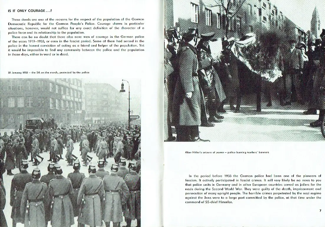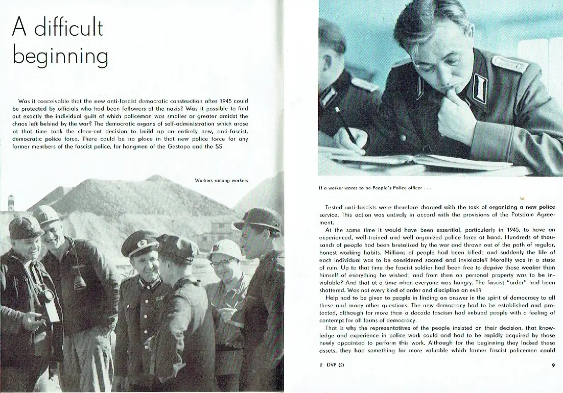 guter Zustand, geringe Gebrauchs- und Alterungsspuren: Umschlag leiht abgenutzt und geringfügig verschmutzt - Umschlag und Seiten teils etwas eselsohrig - Seiten sauber und ordentlich - Rückseite innen und letzte Seite etwas fleckig, extrem rare Propagandaschrift für Besucher der DDR, welche in englischer Sprache in ausgewählten Beispielen den Alltag der Volkpolizei vorstellt - Beware! Danger to life! (Bombenberäumung) - A difficult beginning (aus den Anfängen nach dem Zweiten Weltkrieg) - "White Mice" (Weiße Maus, Spitzname der Volkspolizei, bei der Verkehrsregelung) - The haunted church - Without a chance (Verbrecher ohne Chancen) - This comparison is valid - New times, new tasks We have just presented you with a criminal case which is extremely rare in the GDR. The GDR's social system is stable, the people have confidence in their state; they have a strongly marked sense of justice and the majority of citizens feel responsible for the enforcement of the law. Most criminal offences do not represent any serious threat to society or to people. They are mainly simple thefts doing only slight material damage. In the case of the majority of offenders their deeds are in stark contrast to their general conduct. All this has made possible the fact that in the GDR about 75 per cent of all misdemeanours are punished by disciplinary measures without confinement in prison. Some of the most serious crimes such as attacks by armed gangs on banks, buildings and people, bank robbery in general, fraudulent bancruptcy, the forging of bank notes, rape by hordes have not been committed in the German Democratic Republic for years. A plague such as the banding together of adolescents in gangs of rowdies as exists in western countries has also been broadly overcome. Since the foundation of the German Democratic Republic crime has been decreasing almost constantly. Here is a comparison of crime in the two German states: ...", kartoniert, ca. 14 x 20, 48 Seiten mit zahlreichen Bildern