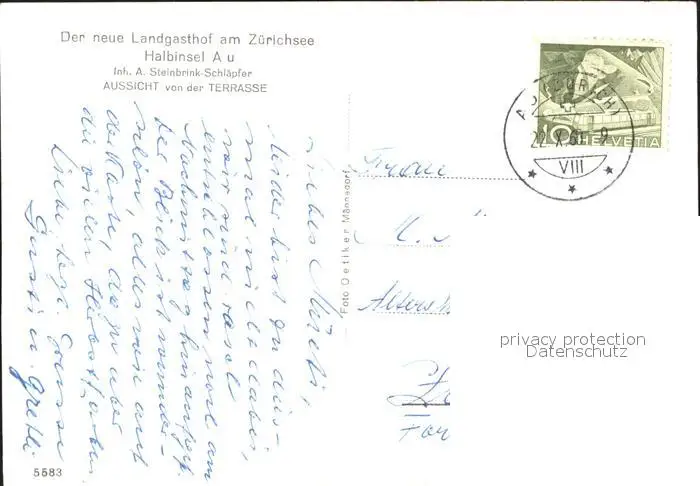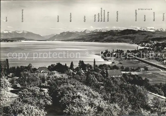 Au ZH Blick ueber Zuerichsee vom Landgasthof Halbinsel Au Alpenpanorama Au ZH postalisch gelaufen 1960 Erhaltung siehe scans Alte Ansichtskarte Postkarte hz Fhwoer