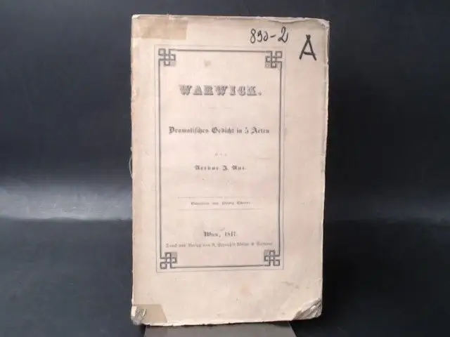 Warwick. Dramatisches Gedicht in 5 Acten. Einband mit teils deutlichen Gebrauchsspuren, an zwei Stellen mit Klebestreifen verstärkt. Buchrücken fehlt fast völlig. Buchblock in zwei Hälften zerteilt (nur noch sporadisch durch Fäden verbunden), wenige Seiten ganz abgelöst. Papier leicht wellig, teils leicht fleckig/knickspurig, tels mit Randläsuren. Wenige Anmerkungen. Akzeptabler Zustand