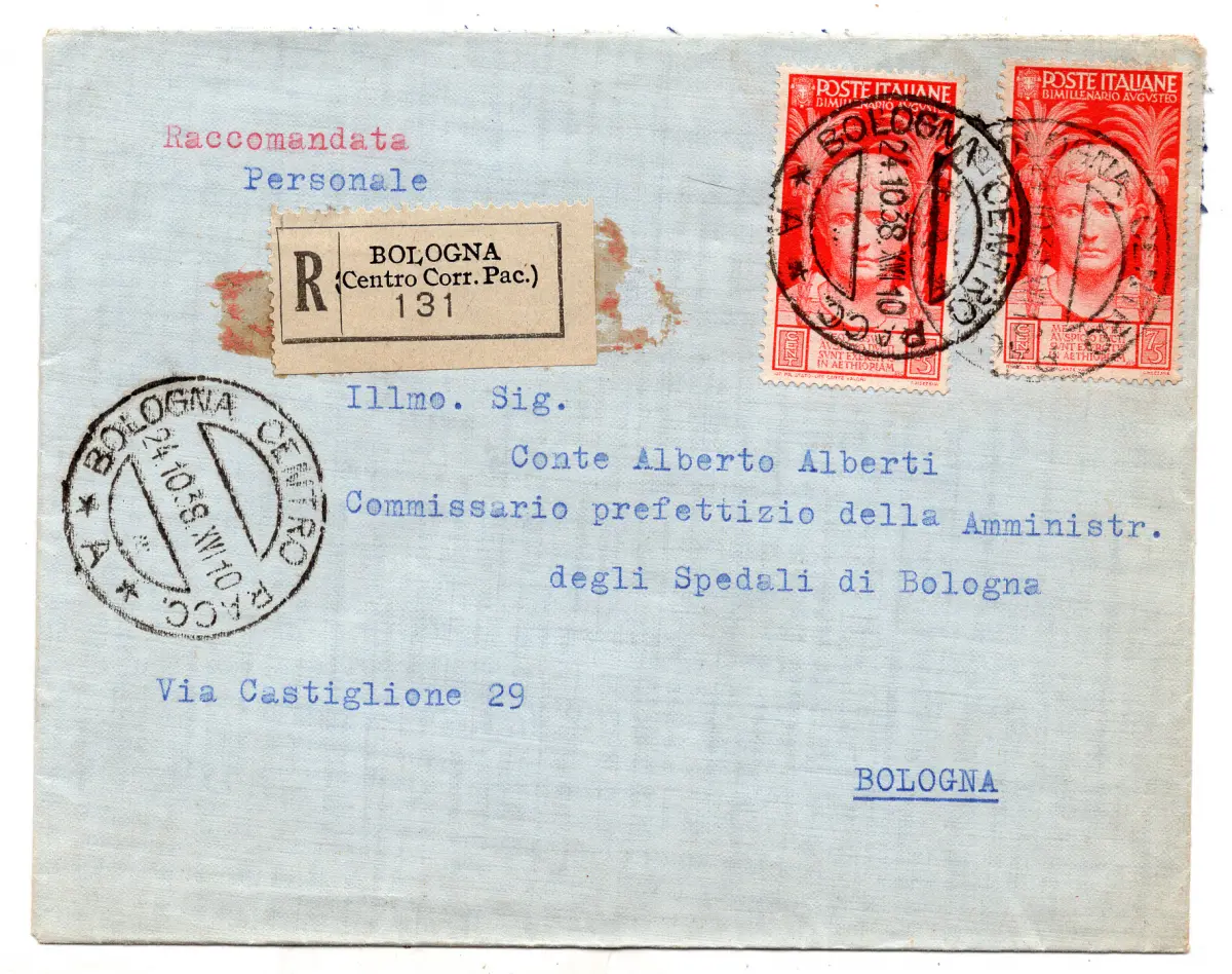 BUSTA - Augusto Cent. 75 Nr. 422 zwei Exemplare auf Umschlag Racc. von Bologna nach Stadt am 24.10.38 Cod.58/182