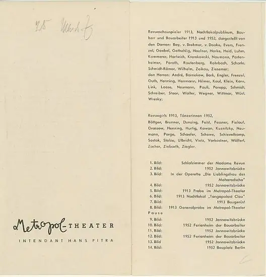 Titel: Programm - Heft zu: An beiden Ufern der Spree. Revue in 14 Bildern. Regie: Gustav von Wangenheim. Bühnenbilder: Hermann Kaubisch. Musikalische Leitung: Martin Velin. Choreographie: Anni Stoll - Peterka. Kostüme: Maria Uhlig. Chöre: Willi Lege. Mitwirkende: Cordy Milowitsch, Richard Rau, Inge von Wangenheim, Fred Kronström, Margot Pretell, Rita Zabekow, Hans Pitra u.v.a. Aufführung: 'Metropol - Theater', Berlin, Friedrichstraße um 1952. Intendant: Hans Pitra