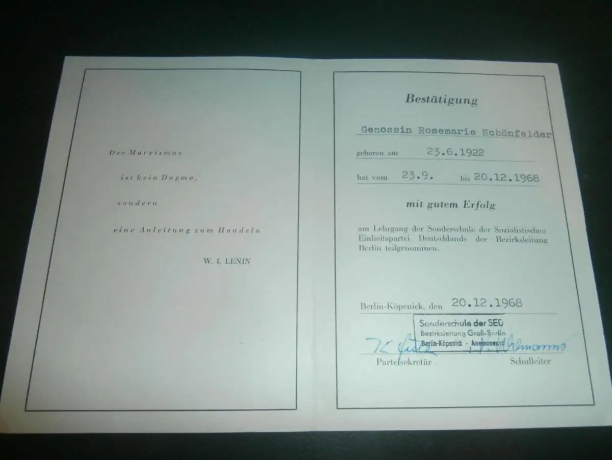 Ausweis / Urkunde 1968 , SED Bezirksleitung Berlin Rosemarie Schönfelder , Sonderschule , Stasi !!!